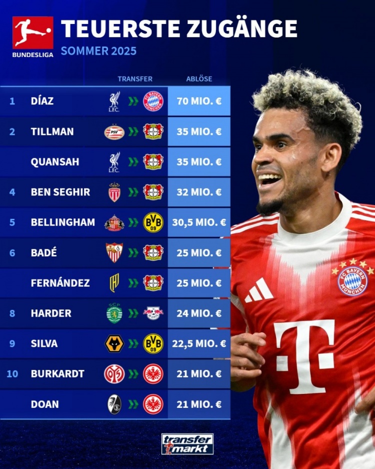 9月4日讯 德甲夏窗已经截止,《转会市场》也统计了德甲今夏的最贵引援榜,路易斯-迪亚斯断崖领跑。