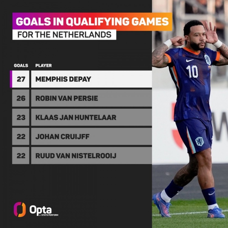 9月8日讯 世预赛欧洲区比赛,德佩梅开二度,帮助荷兰客场3-2击败立陶宛。Opta列出了荷兰队史预选赛(世预赛+欧预赛)射手榜,德佩以27球居首。