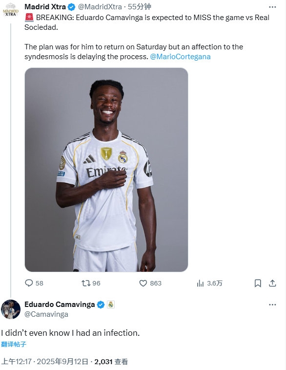 此前据The Athletic报道,皇马中场卡马文加预计将缺席客场对阵皇家社会的西甲联赛。卡马文加回复:“我咋不知道自己受伤了。”