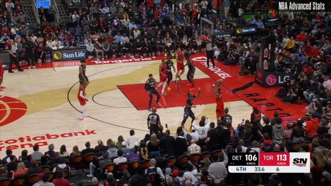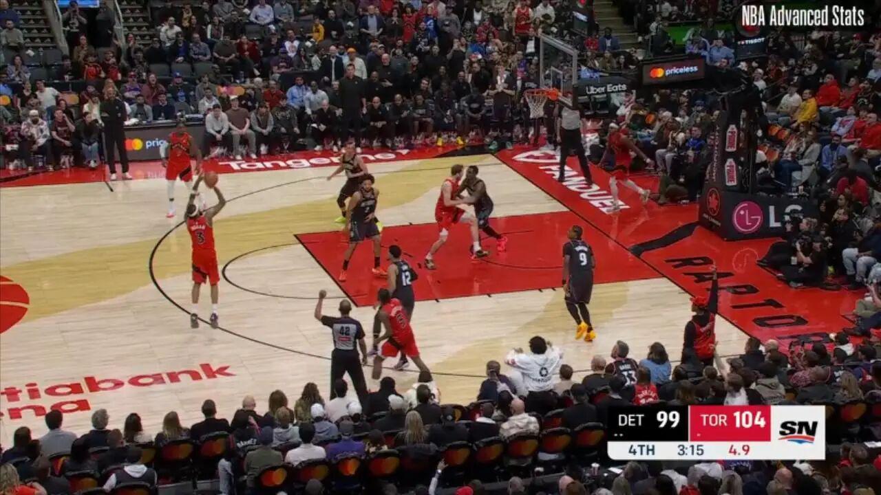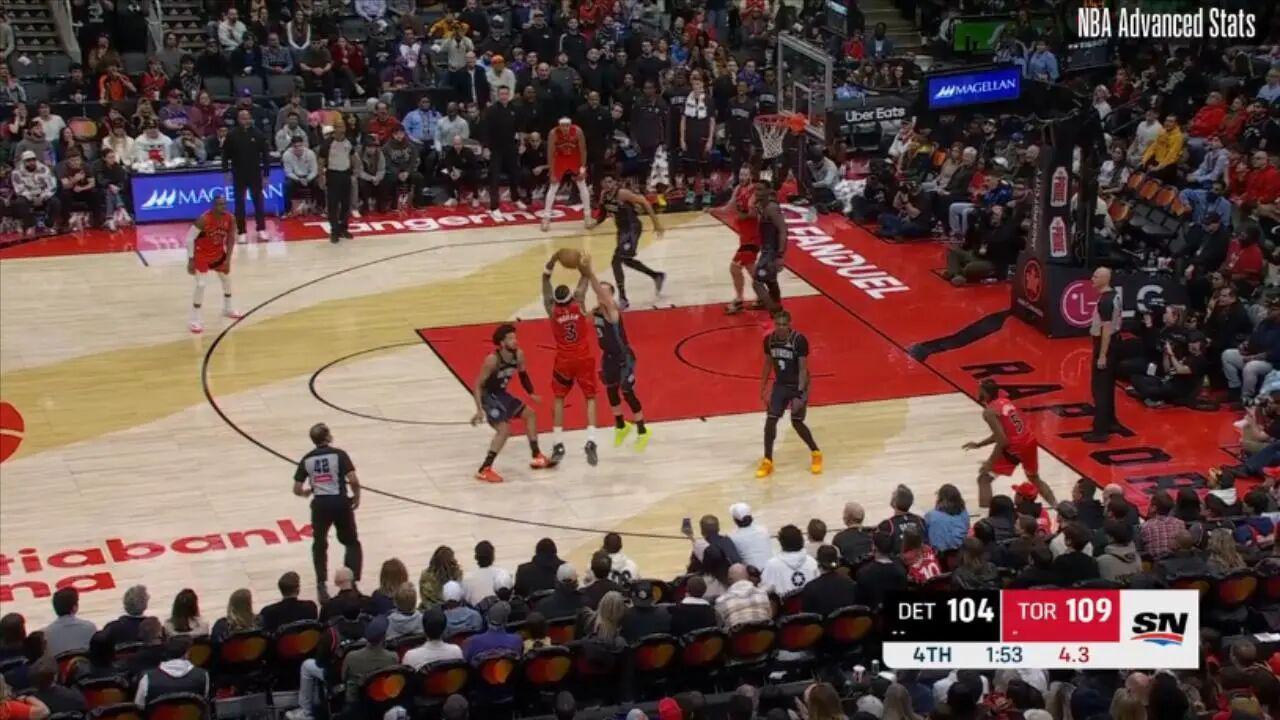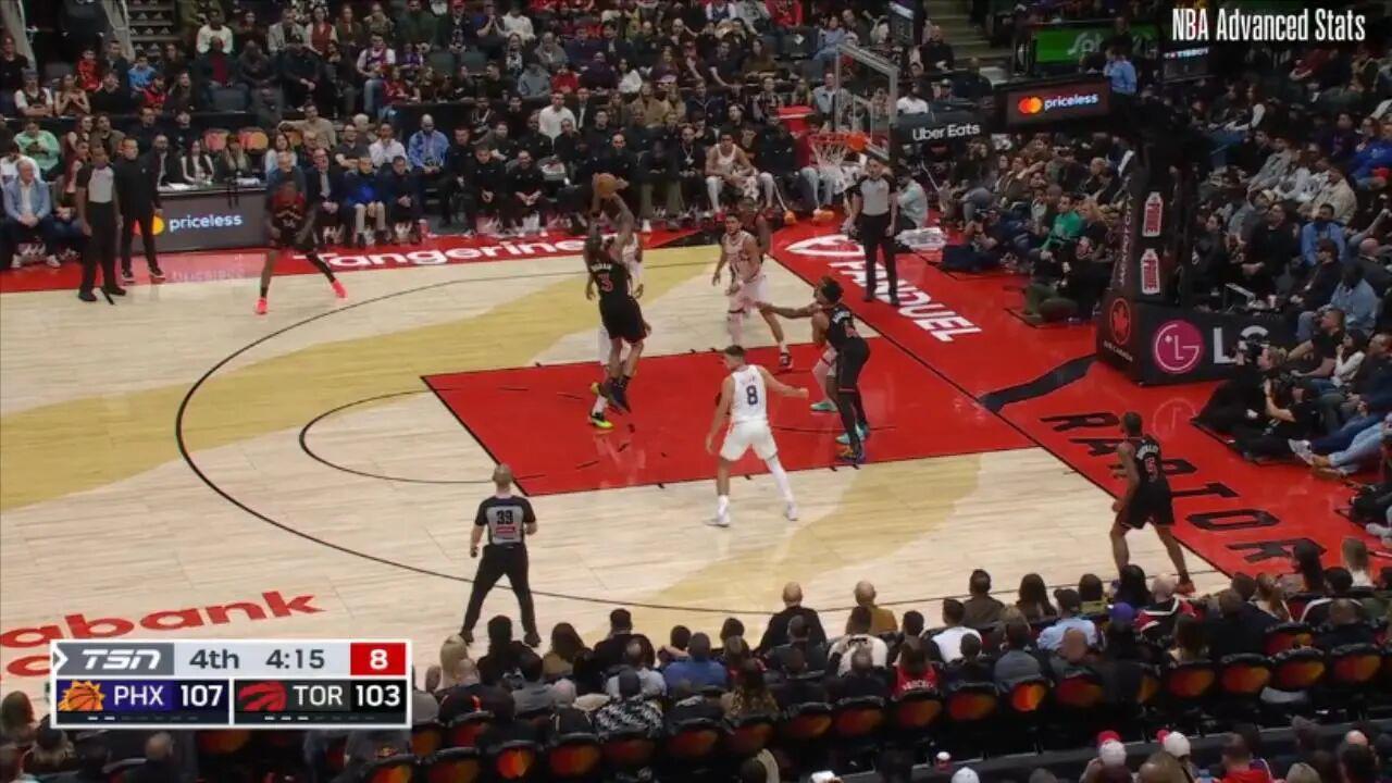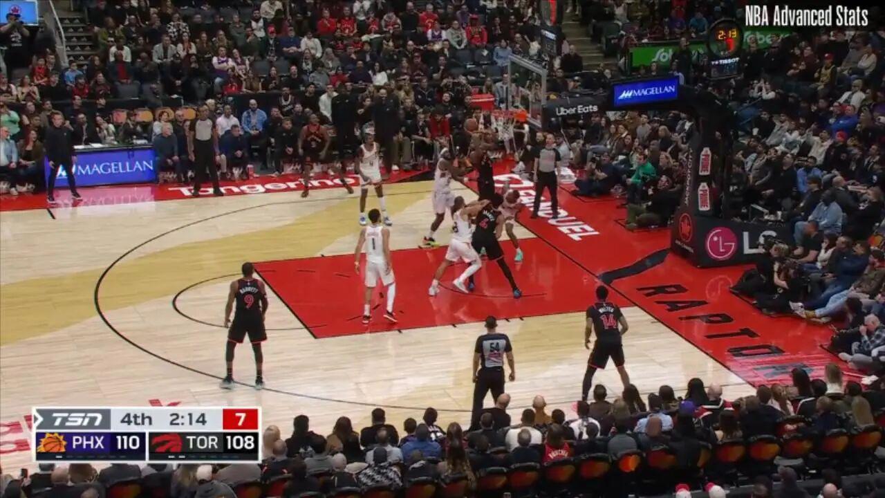 ——剩下31.7秒前,接巴雷特传球,底角大空位三分命中,这一球过后猛龙领先至10分,杀死悬念