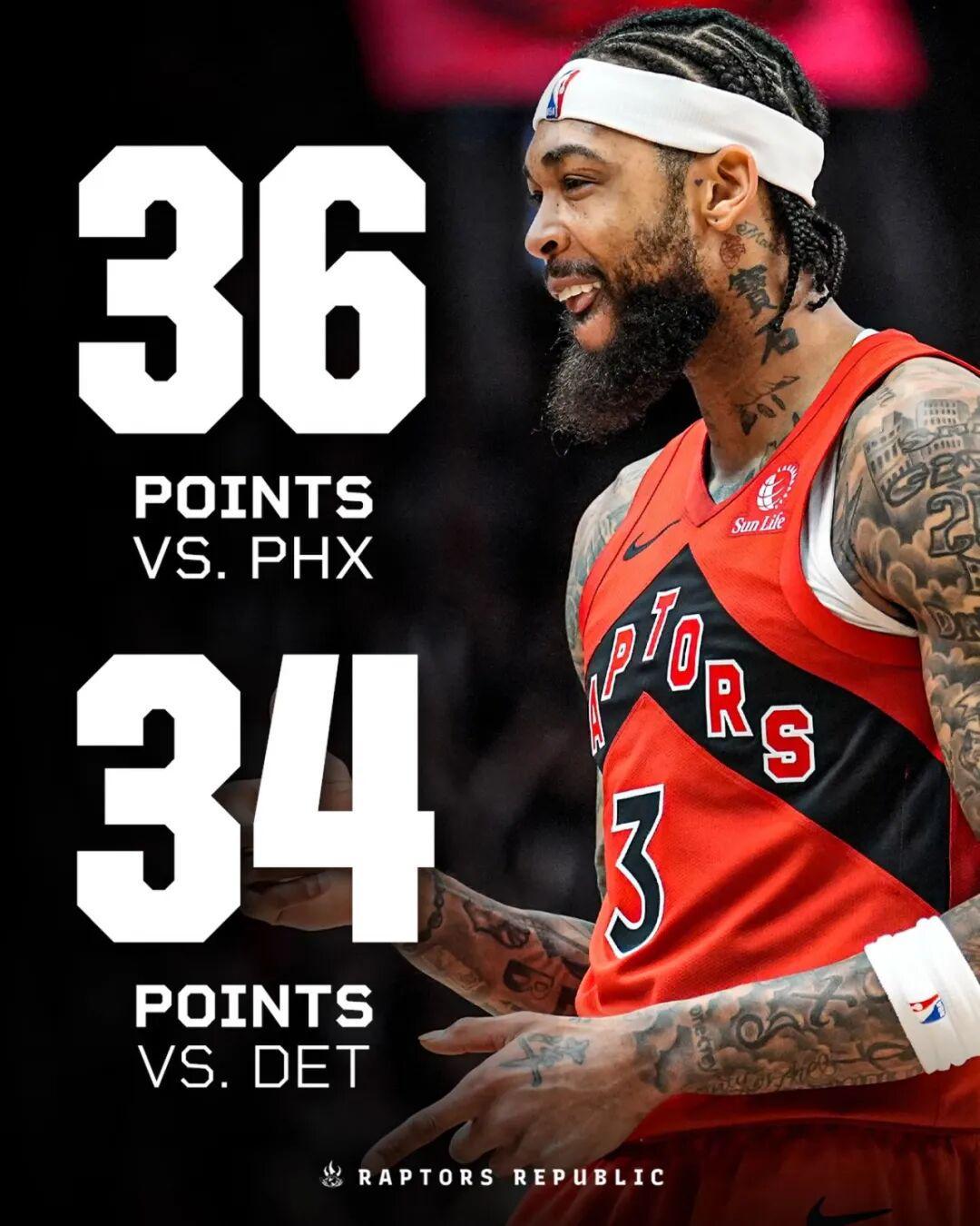 这仅仅是他加盟猛龙之后第二次连续两场30+,其中36分还是猛龙生涯的第二高分(最高分是本赛季初的37分)。